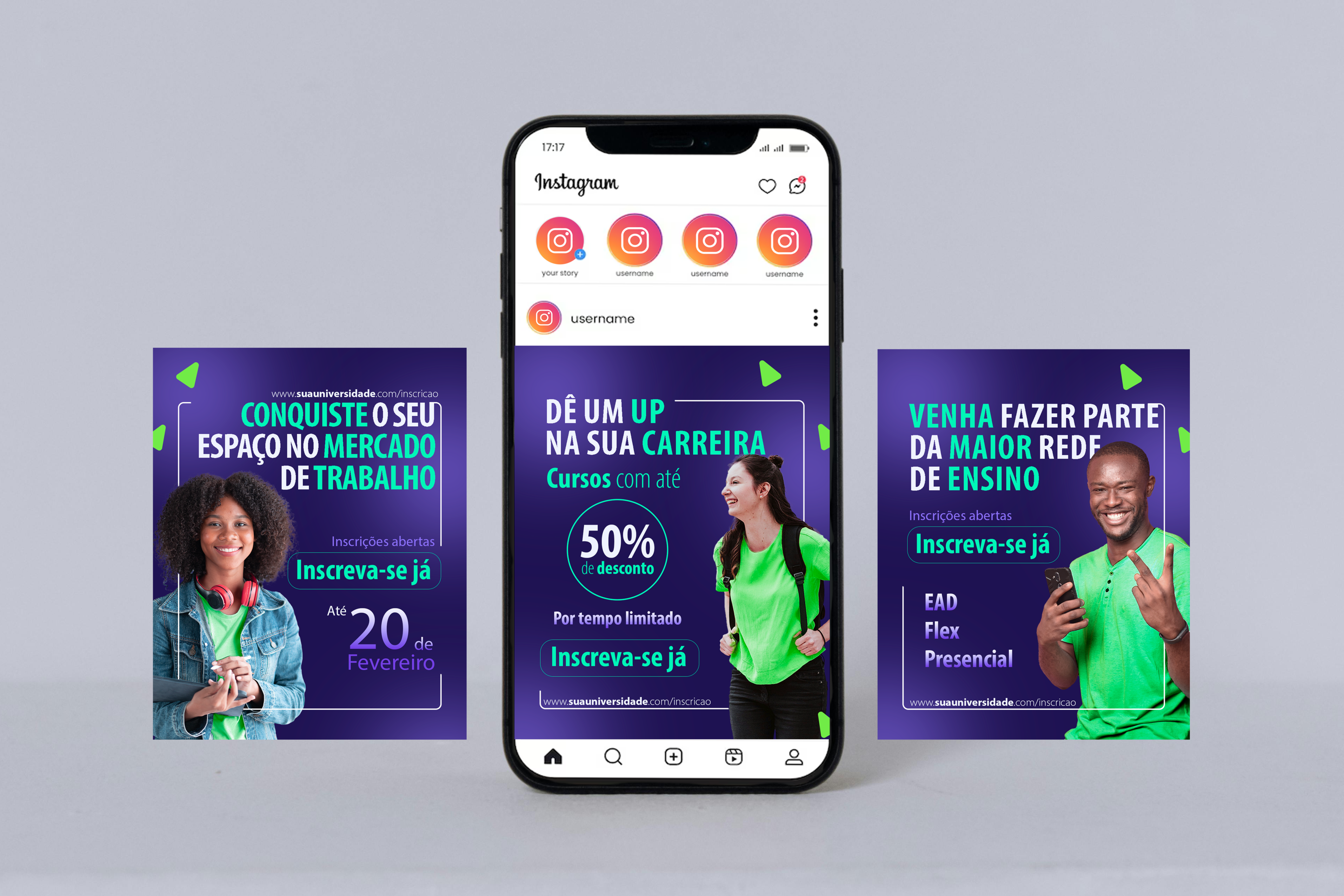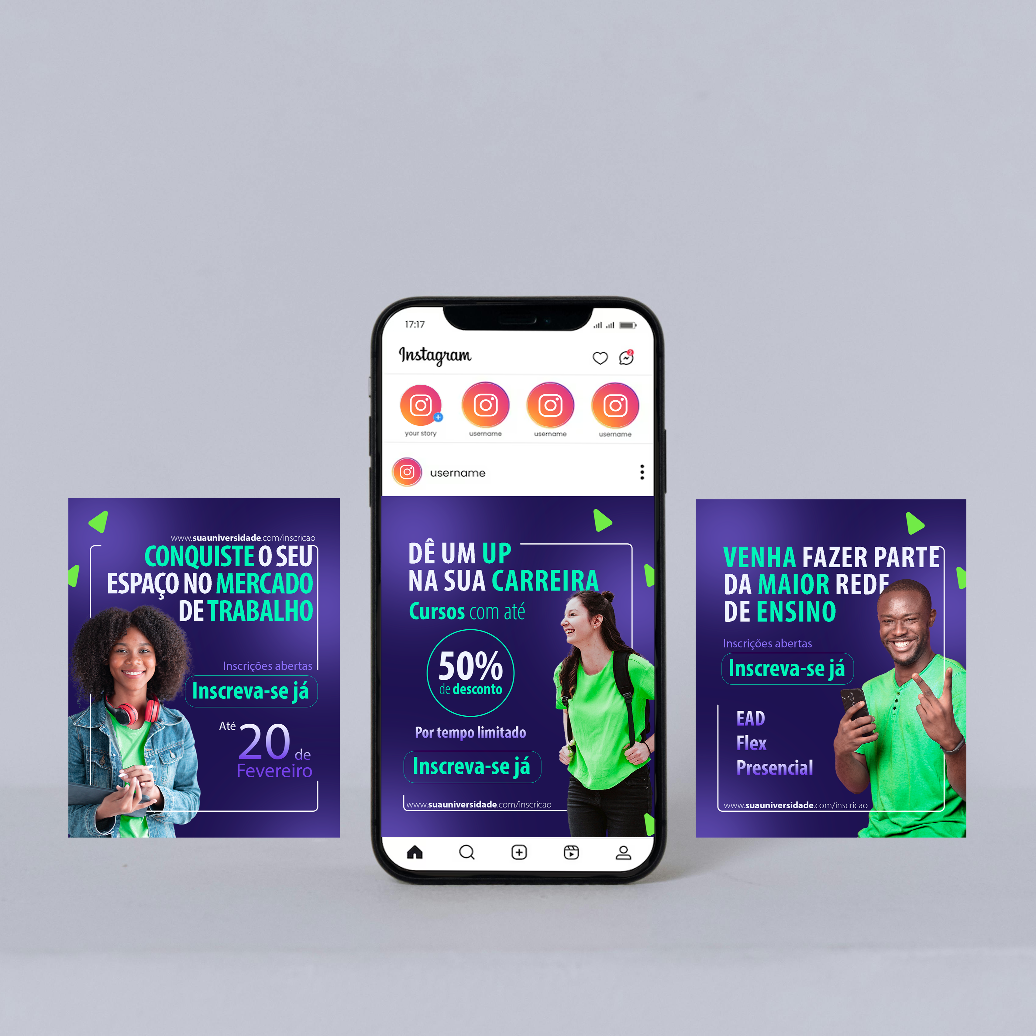 Criativos feito para redes sociais com o objetivo de praticar composição de elementos, cores, tipografia, tratamento de imagem e efeitos.